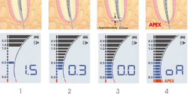 1. When the file is inserted into the root canal, a bar graph displays its progress, with the bar’s position reflecting the position of the file as it descends.